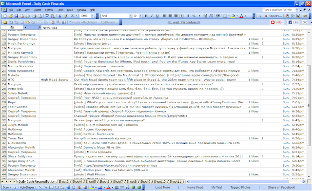 На мешйбл побачив замітку про веб клієнт для фейсбука, котрий маскується під ексель. Такий новий вид соціальної мімікрії, котрий допоможе трохи посидіти в улюбленій соцмережі, не боячись що шеф побачить що ви вже добру годину нічого не робите, а лише переглядаєте фоточки. Тепер достатньо просто зайти на http://www.hardlywork.in/ дозволити доступ до фейсбуку і читати стрічку під виглядом звичайного вікна MS Excel: