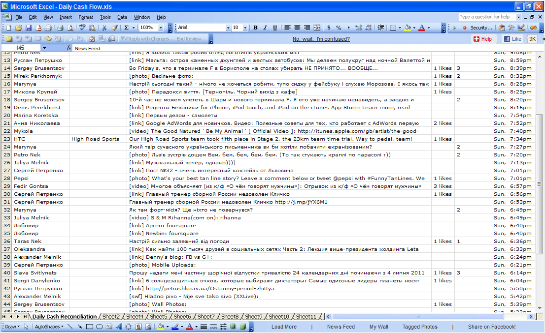 На мешйбл побачив замітку про веб клієнт для фейсбука, котрий маскується під ексель. Такий новий вид соціальної мімікрії, котрий допоможе трохи посидіти в улюбленій соцмережі, не боячись що шеф побачить що ви вже добру годину нічого не робите, а лише переглядаєте фоточки. Тепер достатньо просто зайти на http://www.hardlywork.in/ дозволити доступ до фейсбуку і читати стрічку під виглядом звичайного вікна MS Excel: