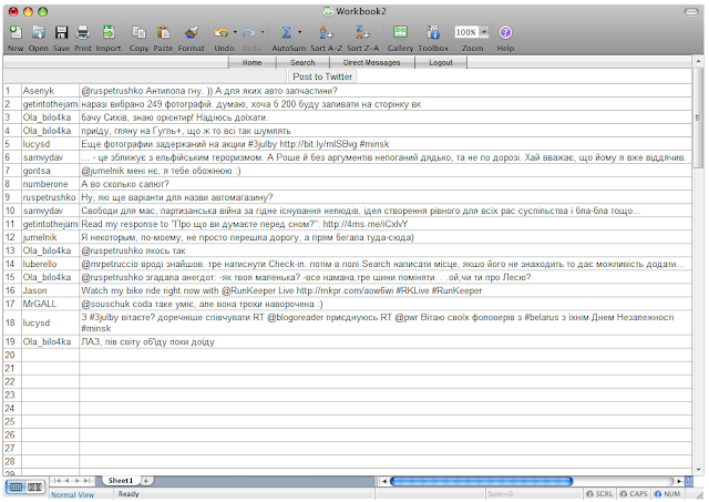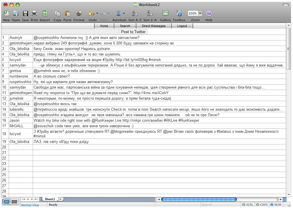 Для твітера також є подібний сервіс http://spreadtweets.elliottkember.com/ котрий також замаскує вашу твітер стрічку під есель правда версію для мака. Колись на сайті автора був також Adobe AIR додаток де можна було налаштувати вигляд, маскуючись під Office OSX, Office 2003 чи Office 2007, правда на разі його немає. Ось так виглядає твітер стрічка в SpreedTweets: